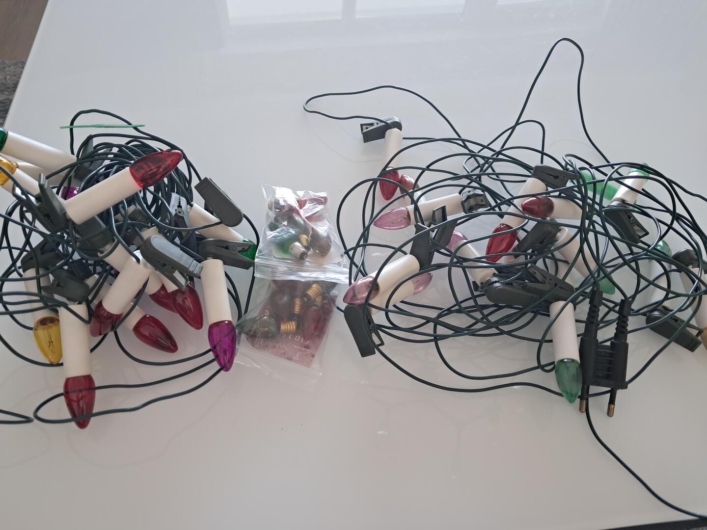 Oddam lampki choinkowe, 2 komplety, z zapasem żarówek za kawę.
