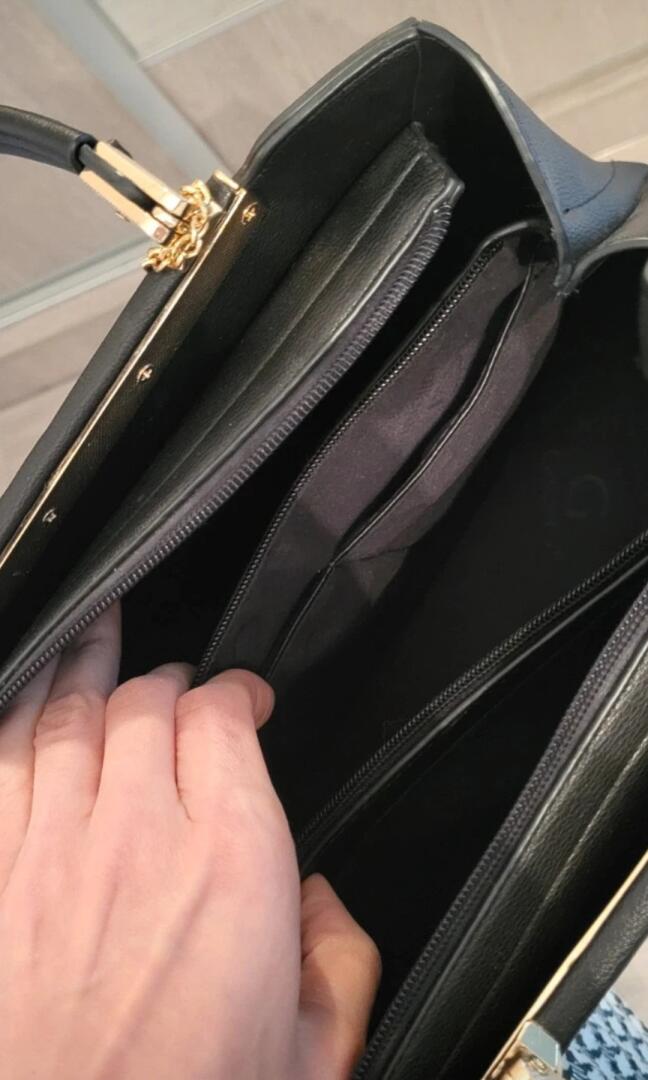 Torebka czarna. Stan idealny. Noszona kilka razy. Skóra naturalna. Wysokość 20 cm, szerokość 15 cm, długość 27 cm. Kilka przegródek. Mieści zeszyt A5. Cena do negocjacji